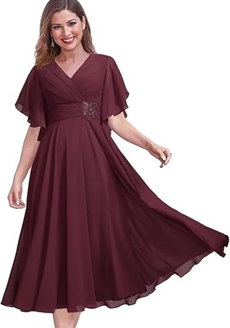 V Neck Chiffon Mother of The Bride Dresses for Women Tea Length A Line Evening Party Dress with Sleeves CY0019