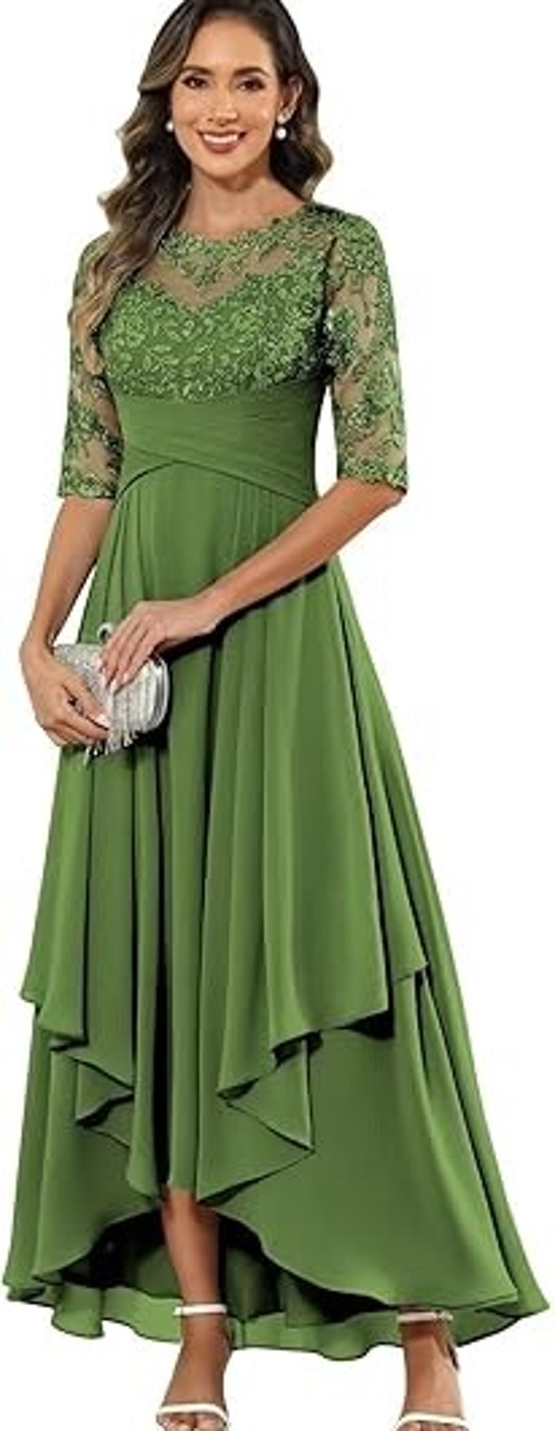 Tea Length Mother of The Bride Dresses for Women Chiffon Lace Appliques Ruffled 3/4 Sleeves Formal Evening Gowns