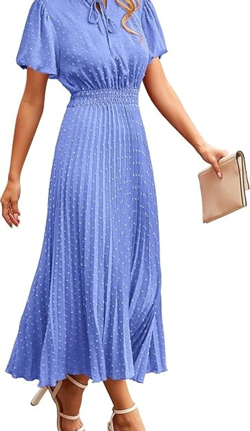 PRETTYGARDEN Womens Summer Midi Dresses Puff Short Sleeve V Neck Swiss Dot Pleated A Line Flowy Long Wedding Guest Dress