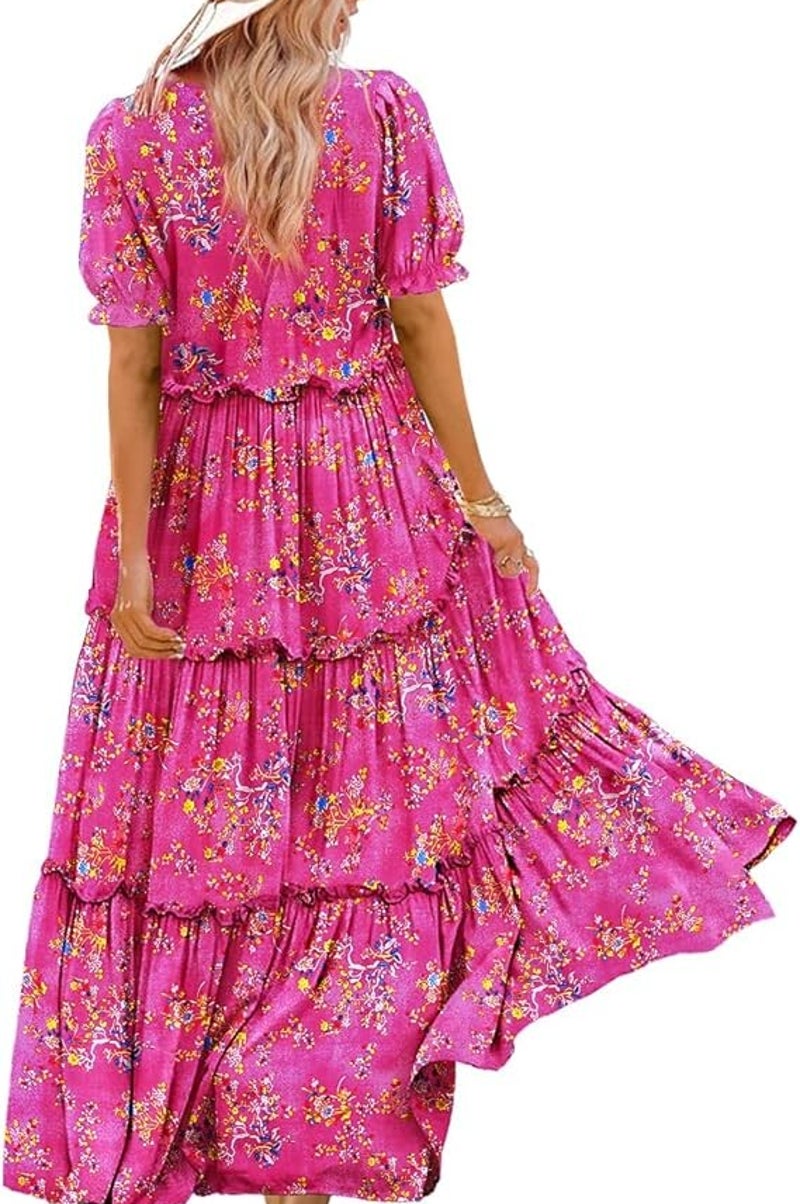 YESNO Summer Casual Bohemian Floral Dresses for Women Puff Short Sleeve Long Maxi Dress with Pockets